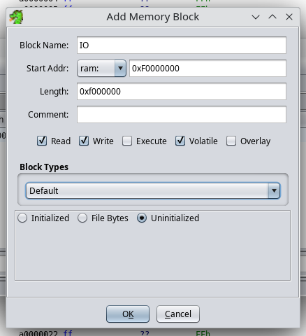 Window -> Memory Mapand set attributes for the "RAM" block:R W X Volatile